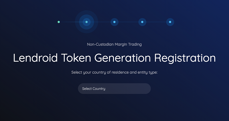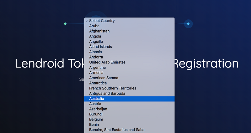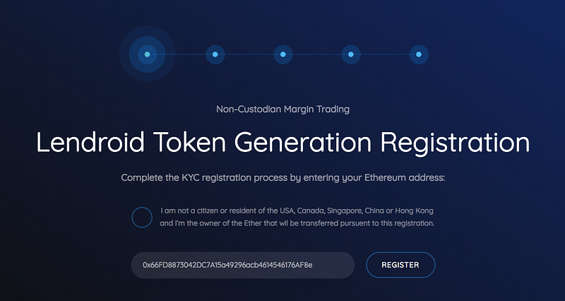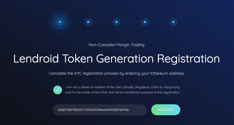 Welcome to the Lendroid Token Generation Registration. This is a view of the landing page. It will require your Ethereum address, and confirmation that you are not participating from the list of restricted countries. Please also ensure that you have full control of the private keys to the Ethereum address, and that you are aware that the Lendroid Support Tokens will be transferred to this address after the TGE.