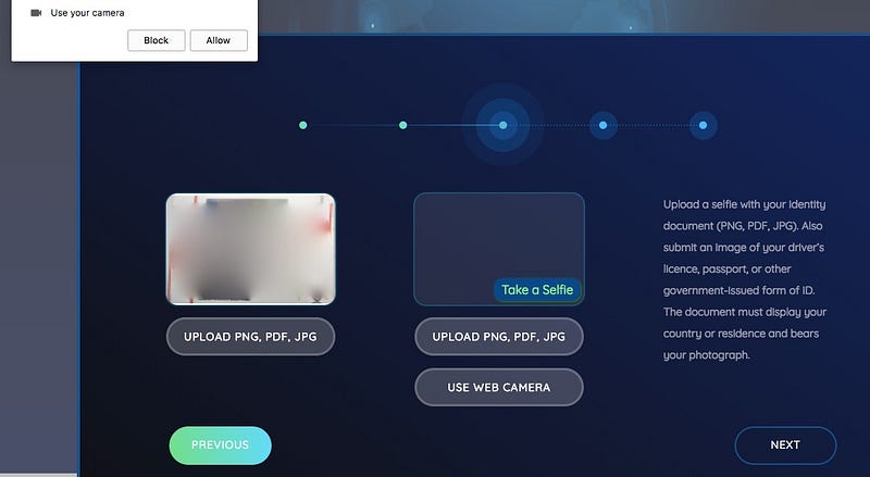 Selfie time. You will need to keep your ID document, which you just uploaded, handy. Please click on ‘Use web camera’. You will be prompted by the browser for permission to use your computer’s camera. Please click allow. Then click ‘take a selfie’ within the frame.
