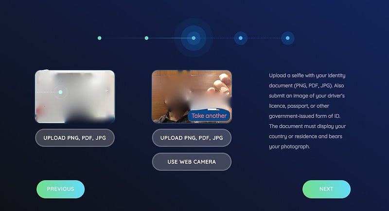 If you are happy with the picture, please click next to move to the next screen. Else, click ‘Take another’. Alternatively, you could take a picture of yourself with the ID on another device, and upload the picture by clicking ‘Upload PNG, PDF, JPG’ on the right side of the frame.