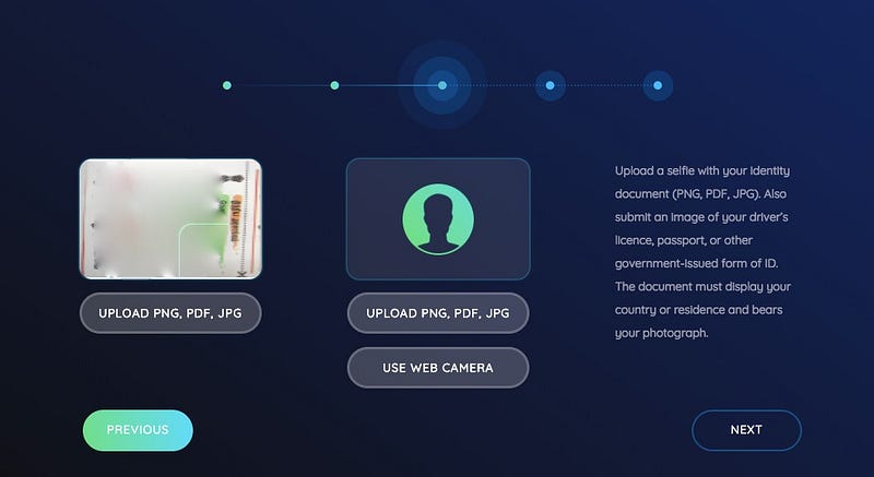 Click on ‘Upload PNG, PDF, JPG’ in the left half of the screen, and upload your government issued ID document, which must disclose your country of residence, and your photograph.